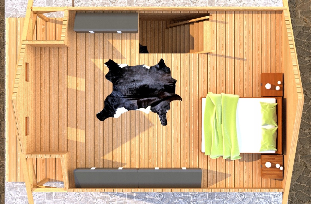 W zestawie domku znajdują się rozkładane schody umożliwiające dostęp na piętro. Oferujemy również opcję schodów stałych, szerokich i stabilnych.