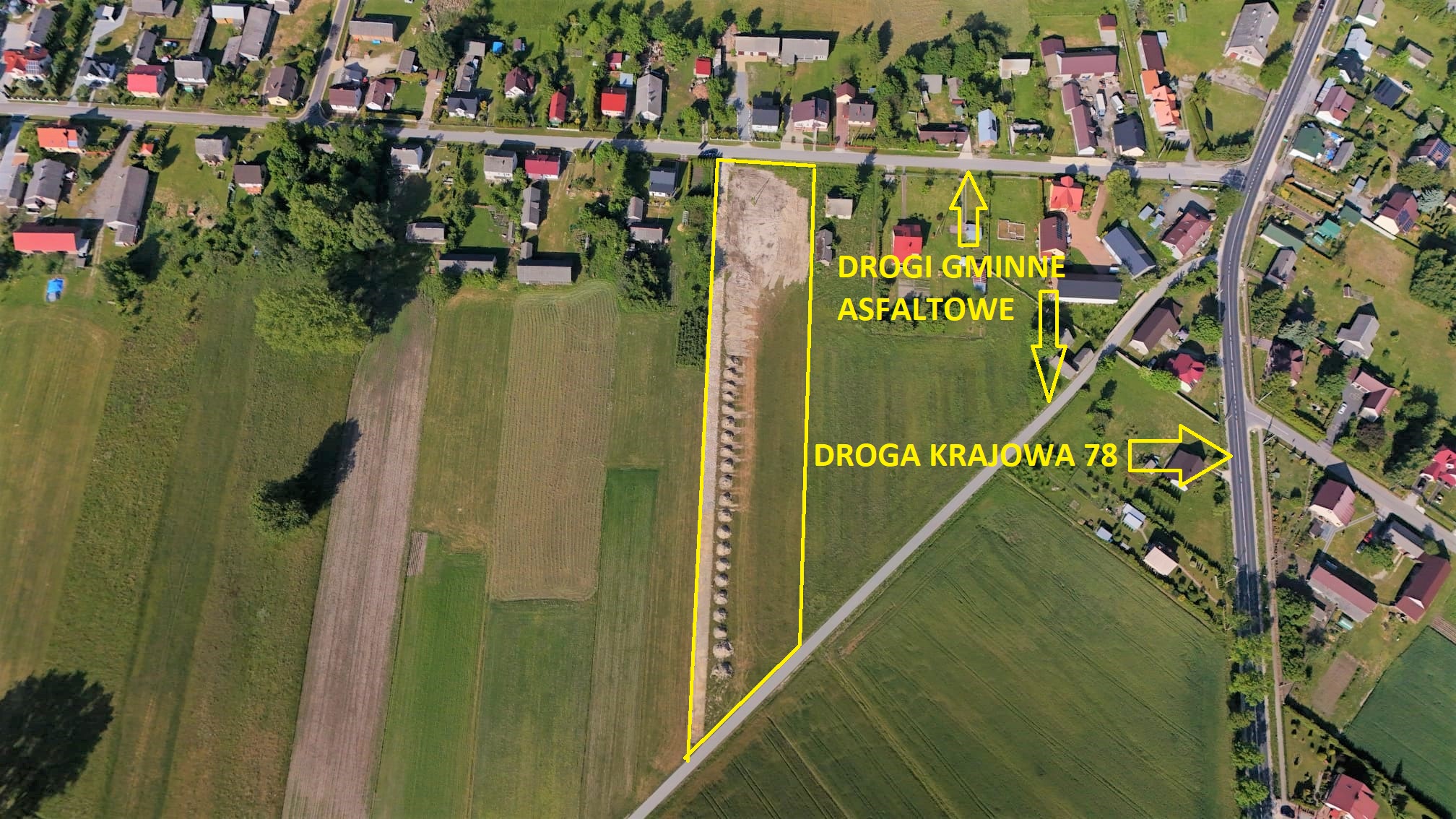 Działki znajdują się około 400m od drogi krajowej 78, zatem dojazd jest bardzo dobry, jest to miejsce atrakcyjne dla inwestora.