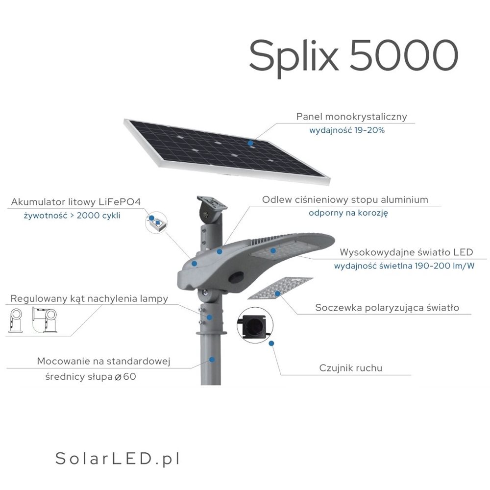 Lampa solarna Splix 5000 sprawdzi się w każdych warunkach od oświetlenia prywatnych posesji, poprzez przestrzeń publiczną jak parki, place zabaw, drogi, ulice aż po oświetlenie obiektów przemysłowych, handlowych lub hotelowych.