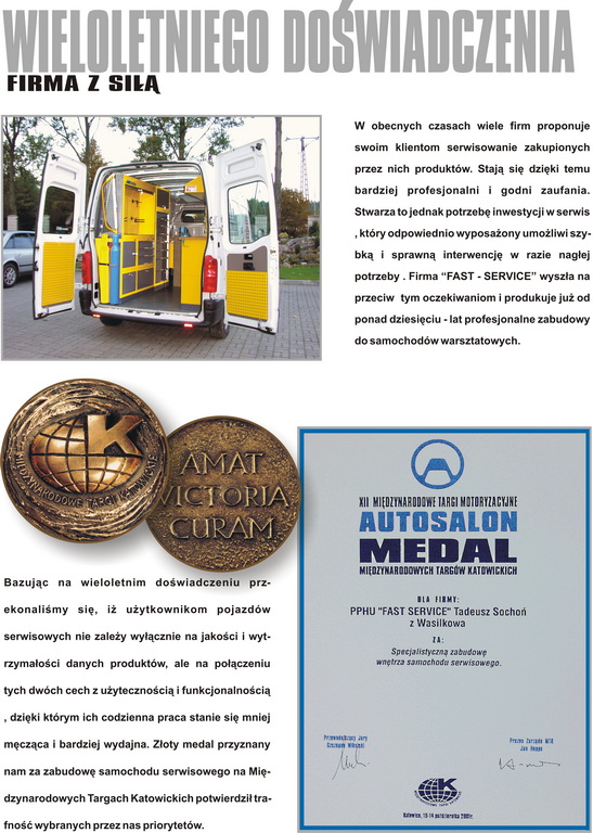 Firma FAST-SERVICE została założona na początku 1991 roku. Jako producent profesjonalnych mebli warsztatowych zajmujemy się całym procesem rozwoju produktu. Zaczynając od opracowania nowych technologii przez wykwalifikowanych specjalistów konstruktorów, poprzez produkcję i dystrybucję. Jako producent mebli warsztatowych oferujemy naszym Klientom szeroką gamę mebli - szafki narzędziowe, wózki narzędziowo-diagnostyczne, stoły warsztatowe, gabloty zamykane roletą aluminiową, stojaki narzędziowe, zestawy szafek pod komputer, szafy BHP, szafy na kartoteki, zabudowy samochodów serwisowych i wiele innych