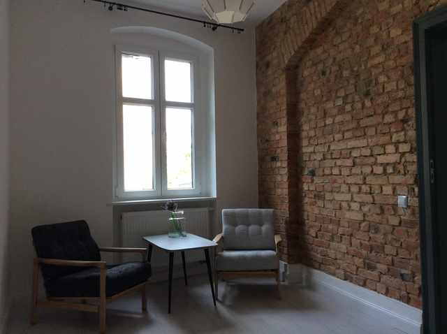Aby zachować kamieniczny charakter, w sypialni odkryliśmy oryginalną ścianę z cegieł, odnowiono jedne z drzwi wewnętrznych.