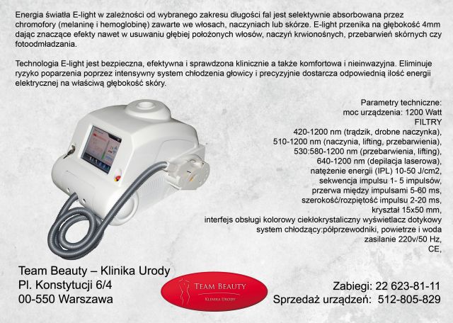 Oferujemy wymianę lamp ksenonowych, serwis laserów, sprzedaż, szkolenia z urządzeń kosmetycznych. Szkolenia prowadzone na najwyższym poziomie dla osób chcących podwyższyć swoje kwalifikacje i dla tych, którzy nie mieli styczności z kosmetyką profesjonalną. Każdy kurs składa się z teorii i praktyki, ceny ustalane indywidualnie. Prowadzący mają bogate doświadczenie i rzetelnie szkolą z pracy na wszystkich urządzeniach kosmetycznych, jak np. laser IPL/E-light. W sprzedaży mamy – znieczulenie w kremie kanadyjskie Dr.Numb, urządzenie do karboksyterapii, laser yagowy, laser IPL/E-light, ulthera. Dostępne też w sprzedaży detalicznej. Wymieniamy lampy w urządzeniach IPL, E-light, Yag. To jakość lampy wpływa na zadowolenie Państwa klientów! My potrafimy idealnie dobrać odpowiedni typ lampy do danego urządzenia. Oferujemy też naprawy, przeglądy i ustawienia właściwych parametrów pracy dla urządzeń kosmetycznych. Kontakt: tel. 505362182 / 226238111, biuro@teambeauty.pl www.teambeauty.pl