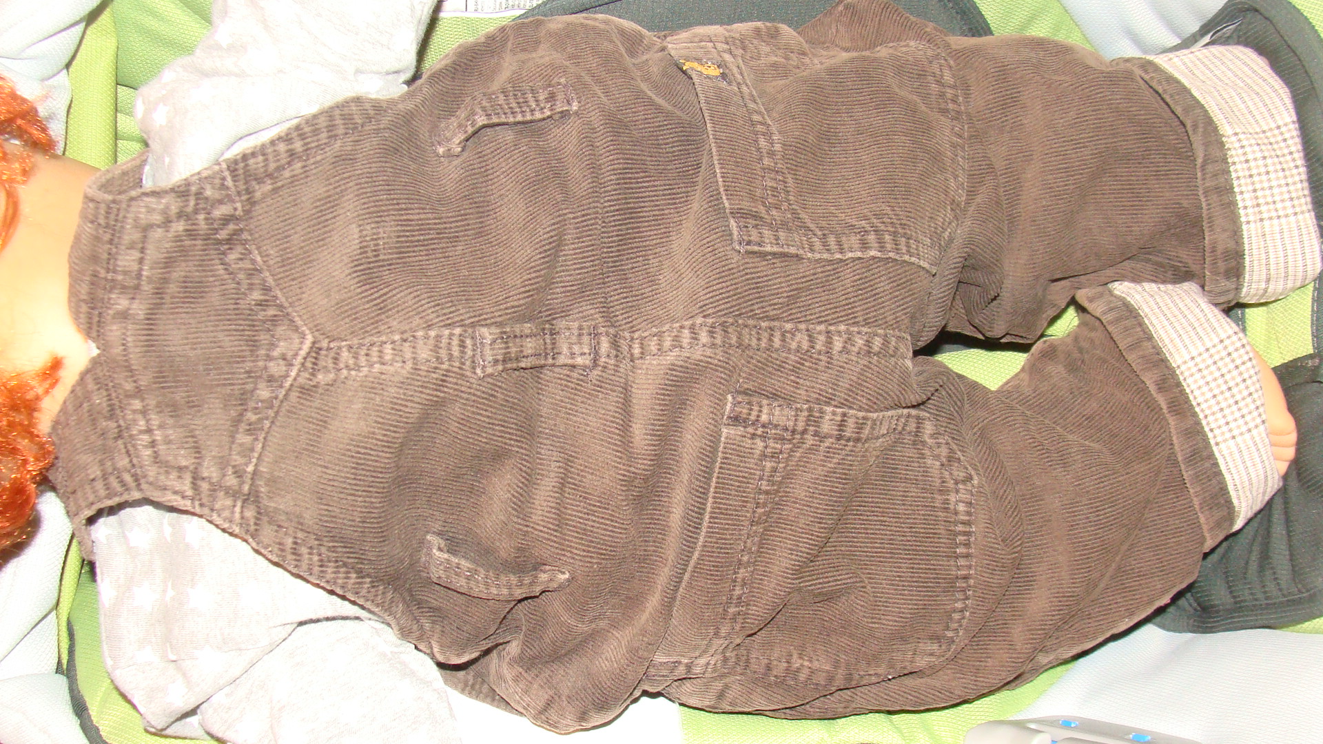 Sztruksowe na podszewce, zapinane w kroku na napy. Można podwinąć nogawki