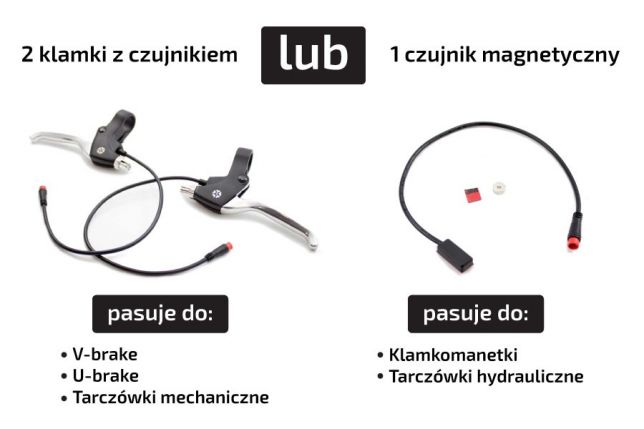 • dwie klamki hamulcowe z czujnikami (na linkę) lub jeden czujnik magnetyczny do hamulców hydraulicznych
