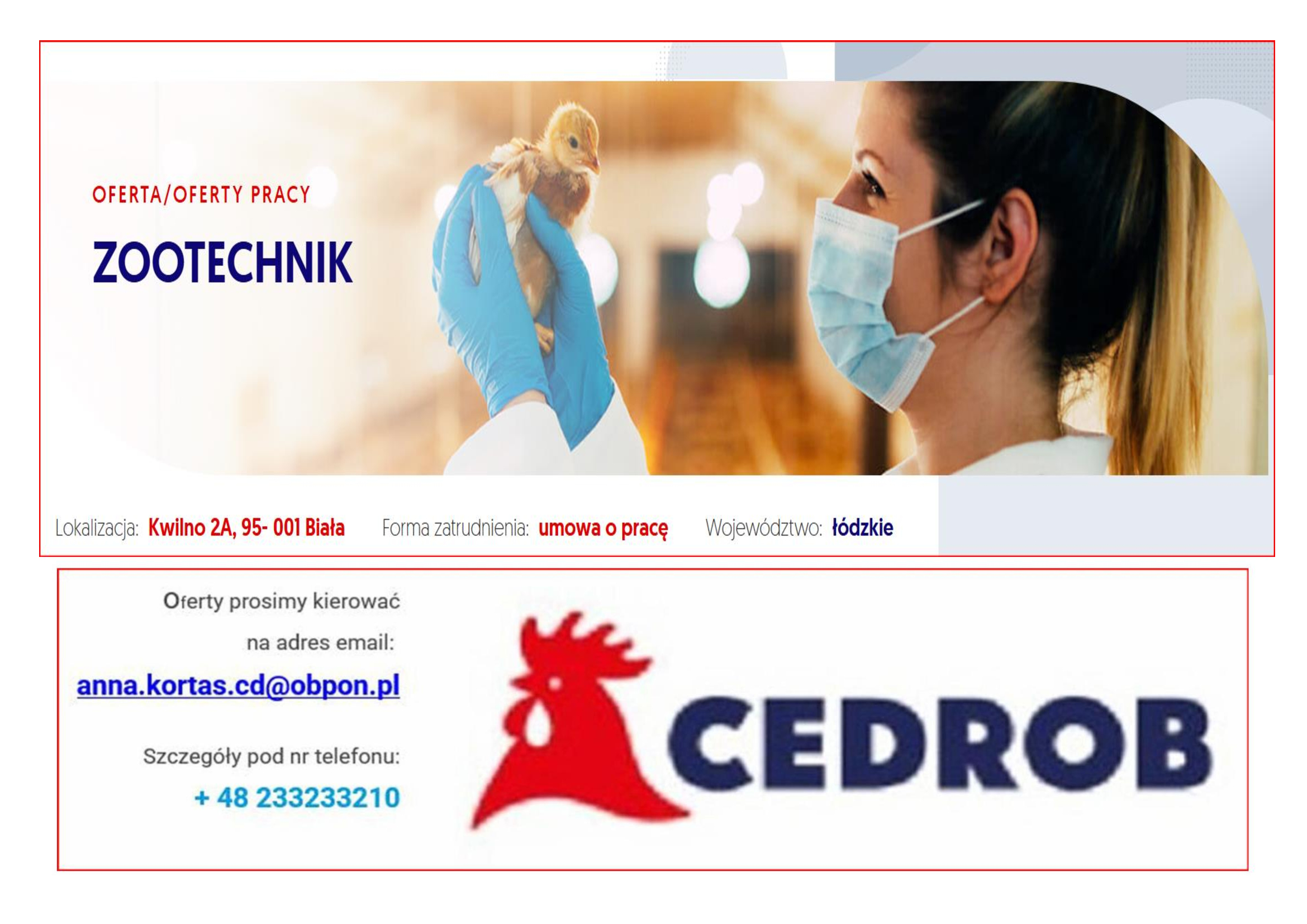 „Wyrażam zgodę na przetwarzanie moich danych osobowych przez CEDROB S.A. z siedzibą w Ujazdówku Ujazdówek 2a, 06-400 Ciechanów, w celu prowadzenia rekrutacji na aplikowane przeze mnie stanowisko”.